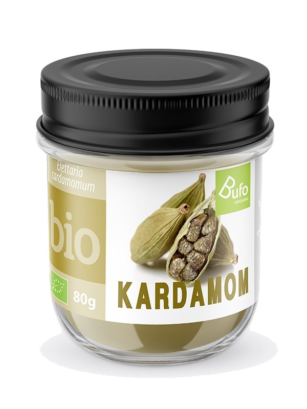 INFORMAZIONI DI BASE: Cardamomo BUFO ORGANIC da agricoltura biologica controllata. Il cardamomo o Elettaria cardamomum è un piccolo arbusto perenne che cresce fino a 3 m di altezza. Proviene dal Sudest asiatico, dove ancora oggi viene coltivato principalmente. I paesi maggiori produttori sono India (particolarmente sulla costa del Malabar), Sri Lanka, Malesia e Papua Nuova Guinea. Era noto anche in Persia, tramite la quale è giunto in Europa oltre 3000 anni fa. Gli antichi Greci e Romani lo conoscevano già, ma lo utilizzavano più per la produzione di profumi che per l’alimentazione. Fiorisce tra gennaio e maggio; i fiori sono bianco‑verdognoli o violacei. I semi di cardamomo vengono essiccati, tostati e macinati.