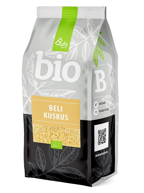 OSNOVNI PODATKI: BIO beli kuskus BUFO ORGANIC je pšenični zdrob, po posebnem postopku pripravljen iz pšenice durum. Domislili naj bi se ga Berberi, avtohtoni prebivalci severne Afrike. BIO polnozrnati kuskus BUFO ORGANIC ima visoko vsebnost prehranskih vlaknin, ki pomagajo k lažji prebavi.