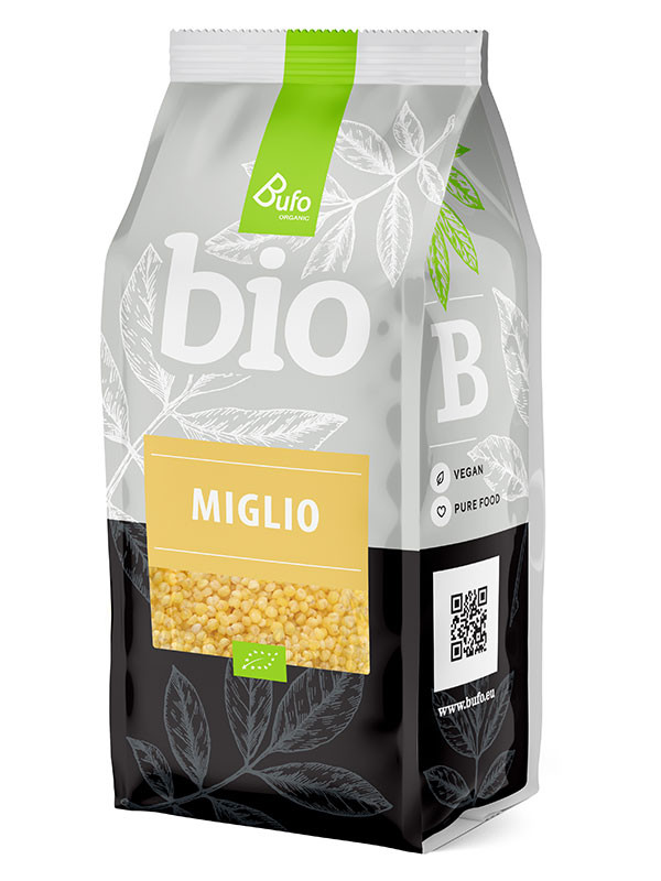 DATI PRINCIPALI: BIO Miglio - porridge di miglio BUFO ORGANIC (Panicum miliaceum) – il suo più grande pregio, oltre al gusto, è che naturalmente non contiene glutine. Il miglio è estremamente saporito, leggermente dolce e contiene innumerevoli nutrienti benefici. Il miglio (Panicum miliaceum) proviene dall’Africa meridionale, più precisamente dall’Etiopia, dove veniva consumato già in tempi preistorici come ingrediente di un particolare pane non lievitato. In molti paesi africani è tuttora parte integrante dell’alimentazione. È molto consumato anche in India e in Asia. Il miglio è un alimento gustoso e completo che può essere preparato in molti modi.