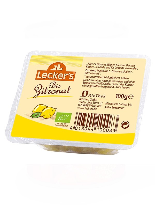 OSNOVNE INFORMACIJE: Pri Lecker's dajejo poseben poudarek izbiri surovin. Bio kandirana limonina lupinica je sestavljena iz kandirane lupine zelo aromatične in debele vrste limone. Ne vsebuje konzervansov, izdelana je ročno, sondažni stroj pa doda ekološki koruzni sirup.
