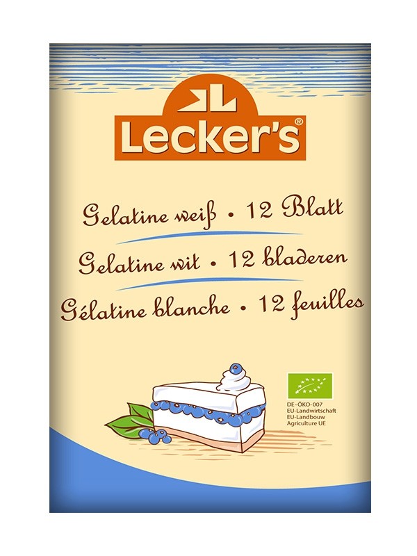 INFORMAZIONI DI BASE: La gelatina biologica LECKERS è adatta per gelificare e addensare piatti dolci e salati, preparare gelatine e varie creme. L'agente gelificante biologico in fogli è una proteina di collagene pura a base di pelli di suino biologiche.