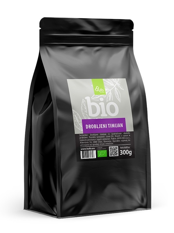 INFORMAZIONI DI BASE: Timo tritato BUFO ORGANIC da produzione biologica controllata. Il timo oThymus vulgaris appartiene alla famiglia delle Lamiaceae. Il timo è anche conosciuto come serpillo. È un arbusto che cresce fino a 40 cm di altezza e si incrocia facilmente con altre specie. La patria del timo è il Mediterraneo, ma era già conosciuto dagli antichi Egizi. Ci sono diversi tipi di timo, che differiscono per intensità di odore, aroma e sapore. Durante la cottura, il timo mantiene un odore e un sapore forti e distinti, ma è importante sapere quando aggiungerlo. Se vogliamo che sia più forte nel sapore, aggiungiamolo all'inizio della cottura o della cottura. Se non vogliamo un sapore più distinto, lo aggiungiamo alla fine della preparazione.